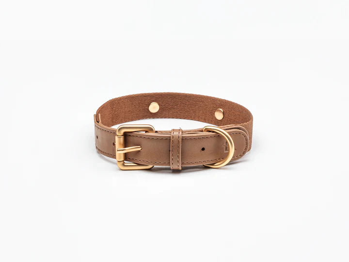 A durable, stylish beige collar with gold hardware for everyday walks. Adjustable fit for comfort and security.